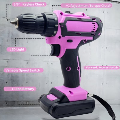 [24/65PCS電源ツールセット] 24PCSまたは65PCS産業電源ツールセット | ピンクブラシレスドリルまたはCrVツールキット | 21Vデュアルリチウムイオン(2×1200mAh)